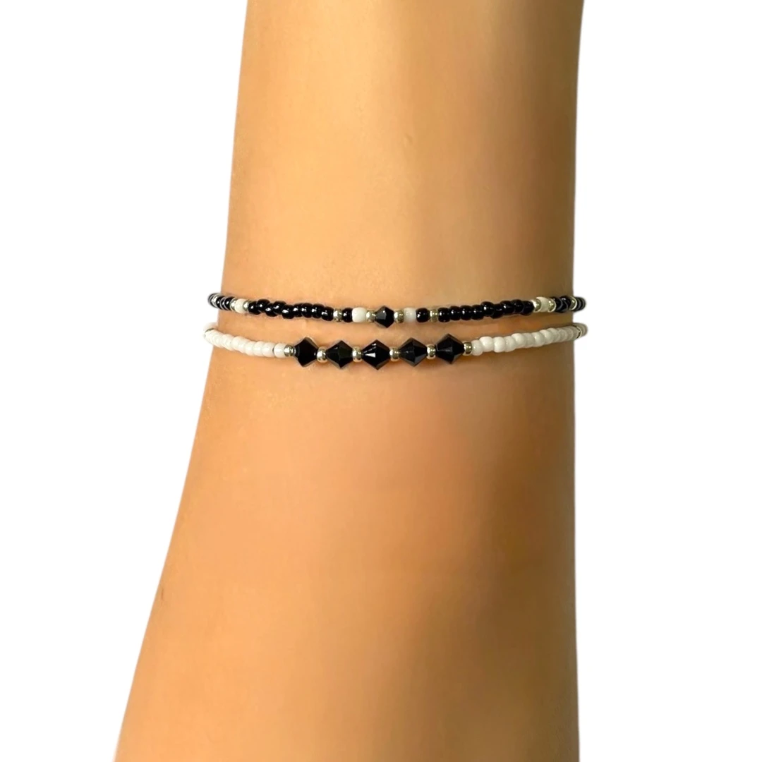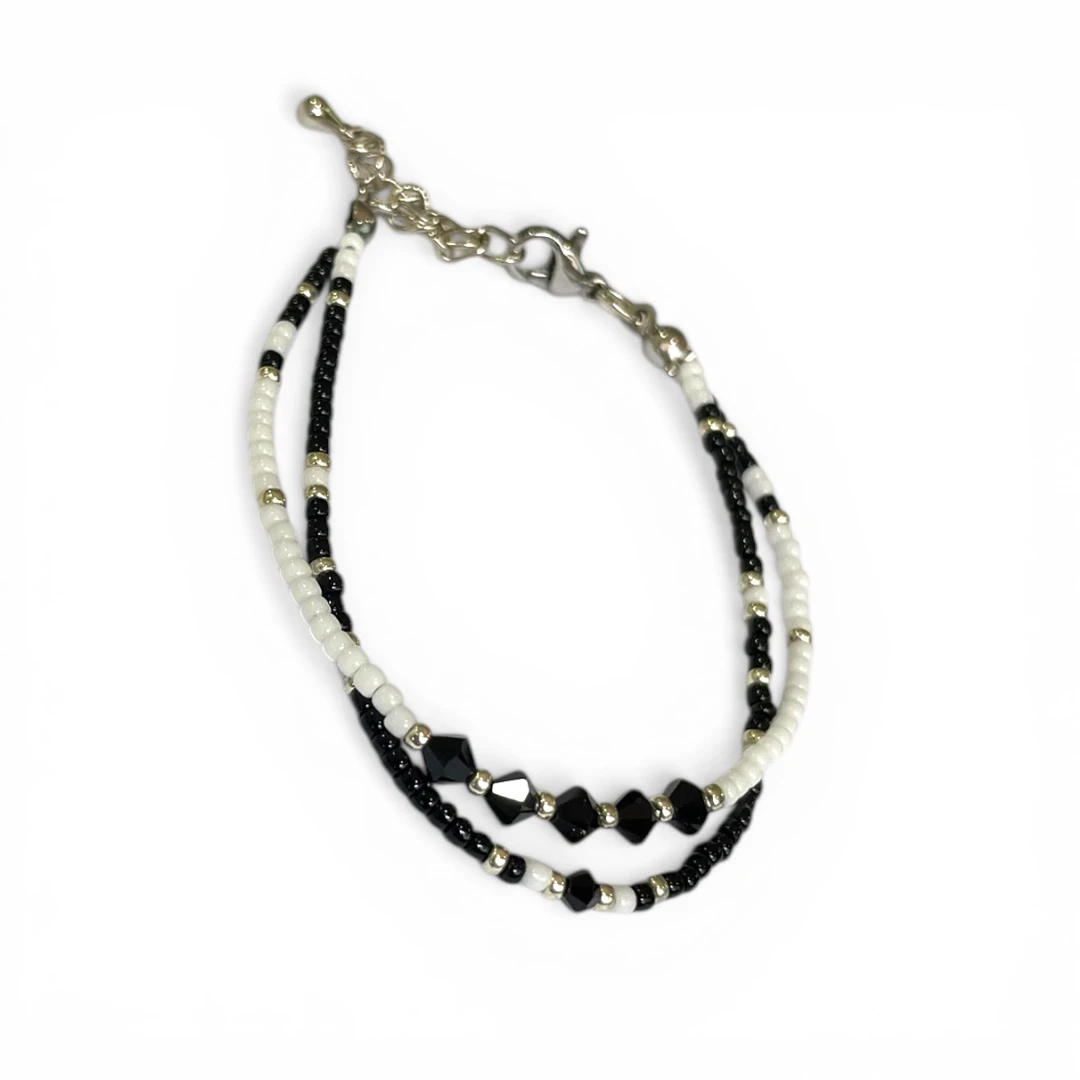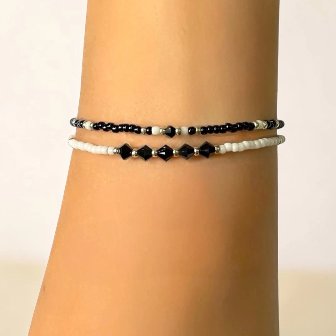 An adjustable bracelet handmade with Japanese seed beads and Swarovski crystals. Comes as a set with both chains connected together for easy wearing.