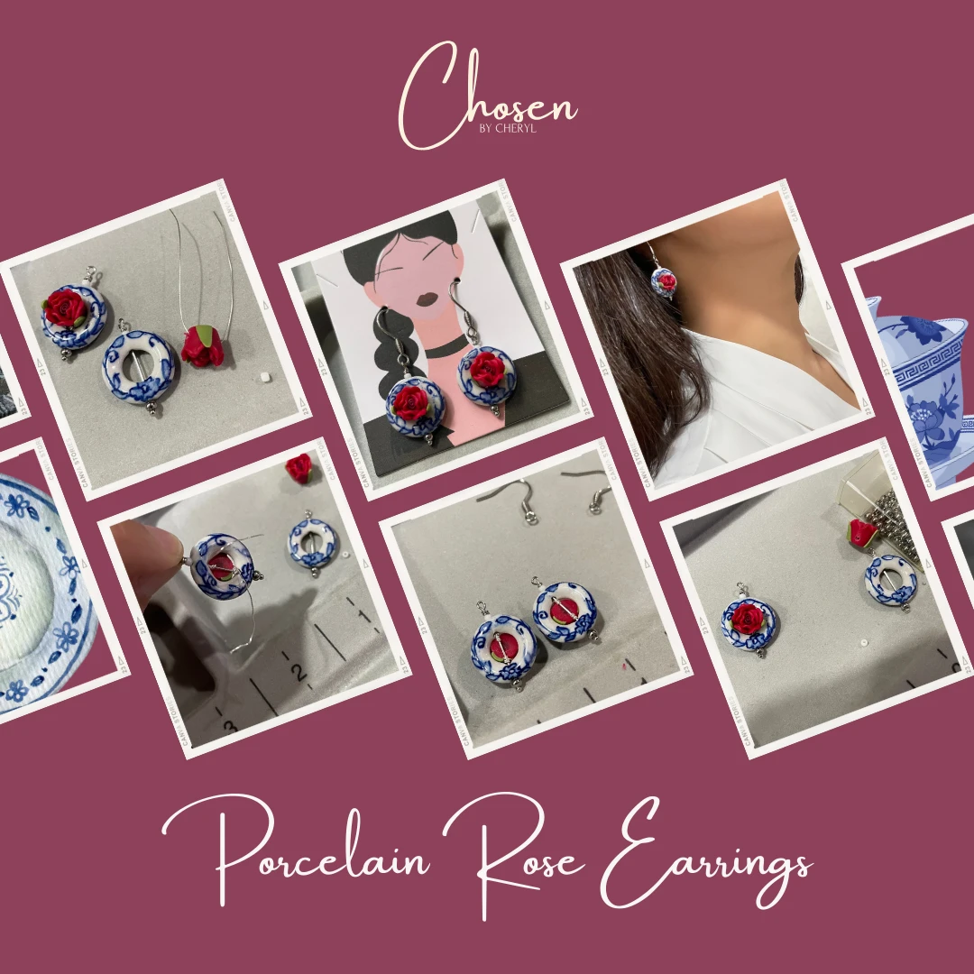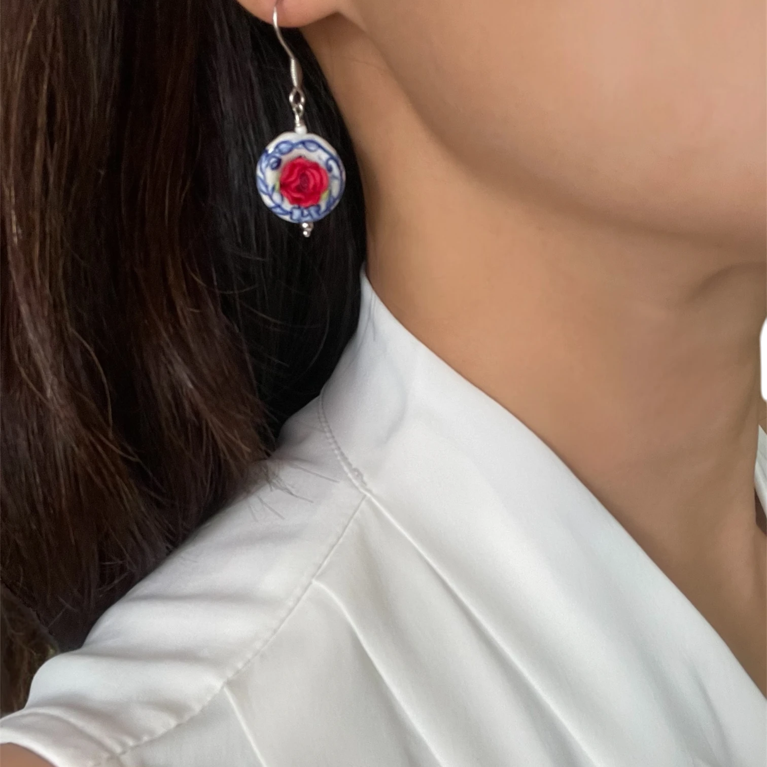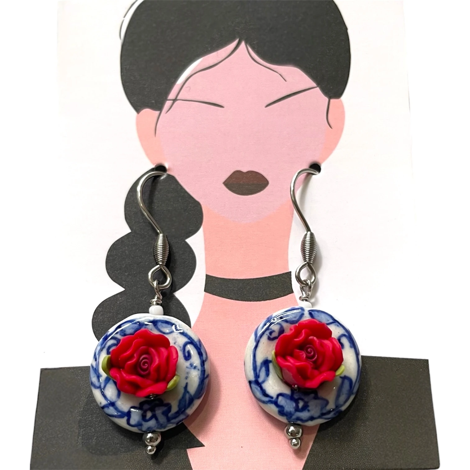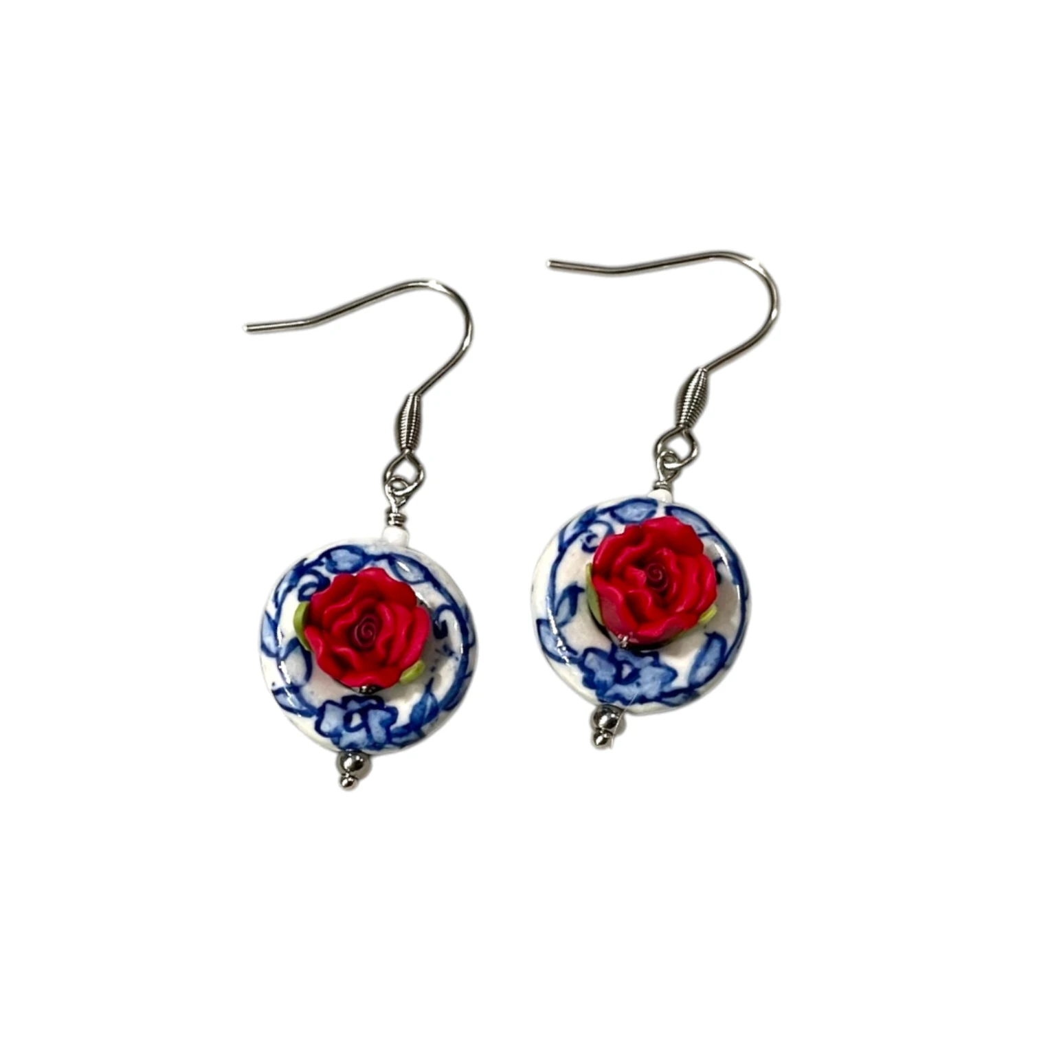 Made from porcelain donut beads and red rose flowers purchased from Japan. Red rose polymer clay flowers are secured via wire wrapping by hand. Stainless steel ear hooks complete this piece. Length: 4.6cm 🎨 Design Features