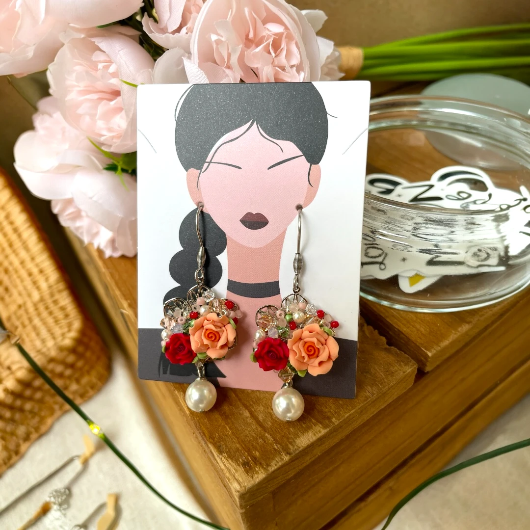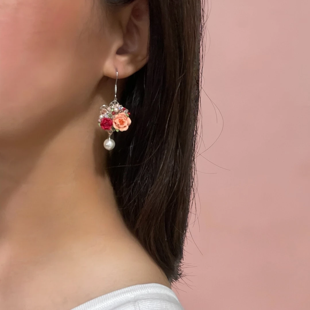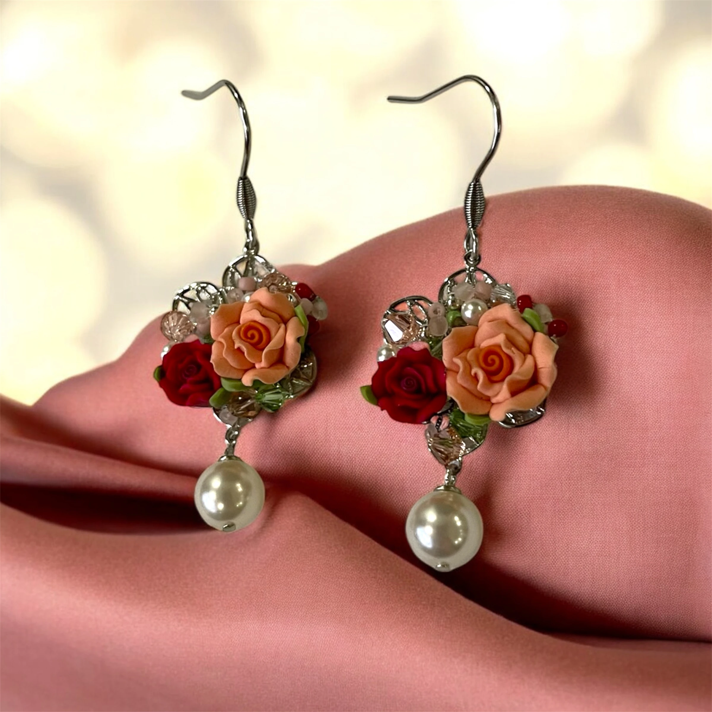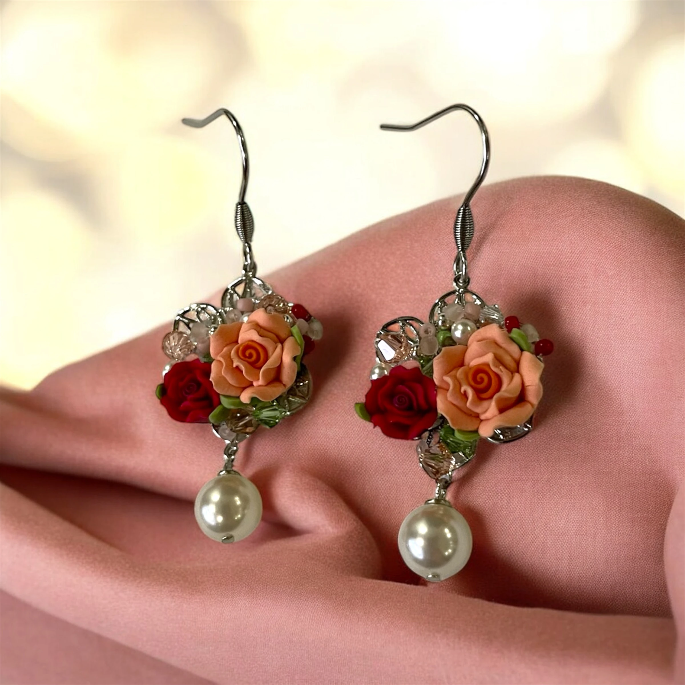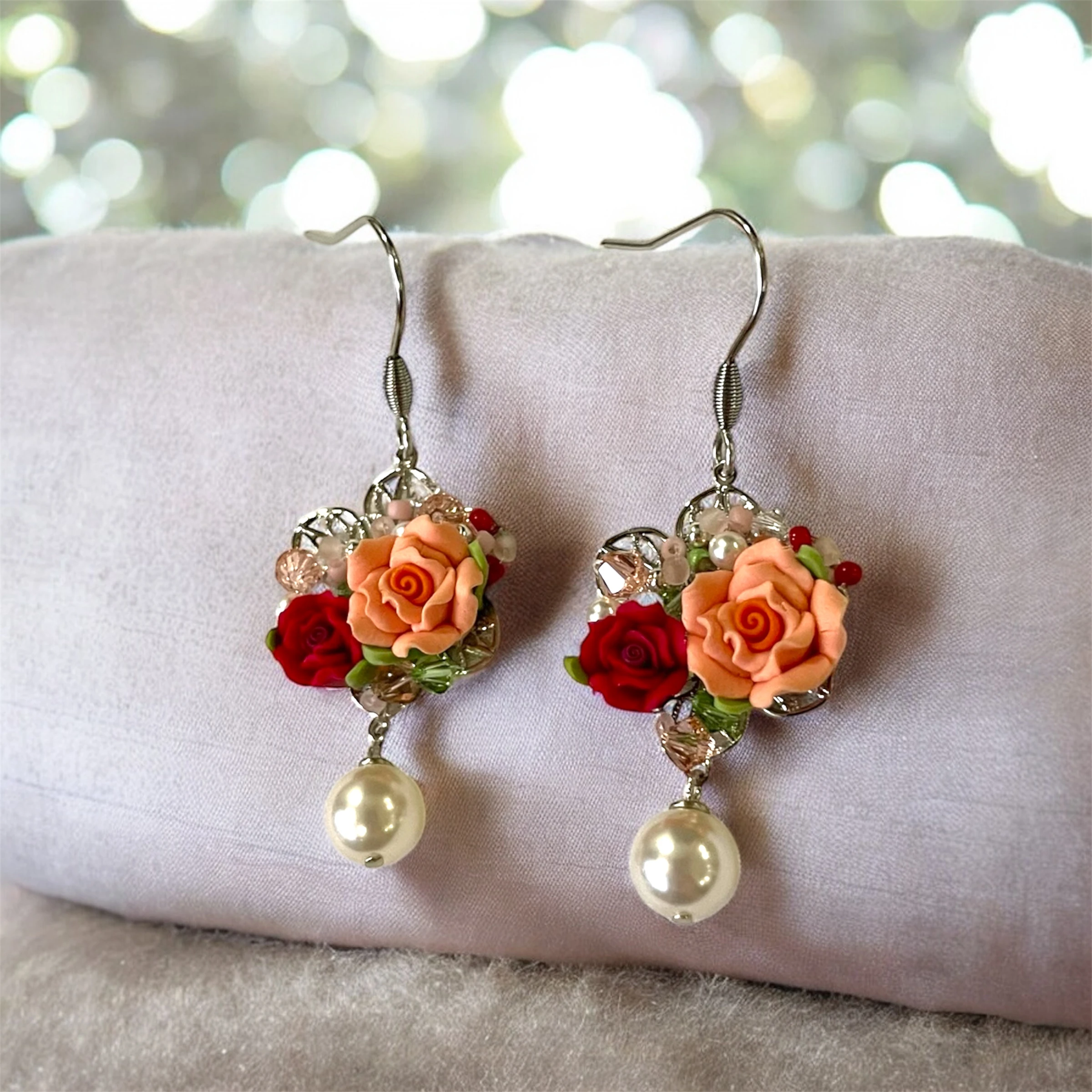 Polymer clay flowers, Swarovski crystals and Japanese seed beads are wire wrapped on the filigree and decorated with Swarovski pearl drops.