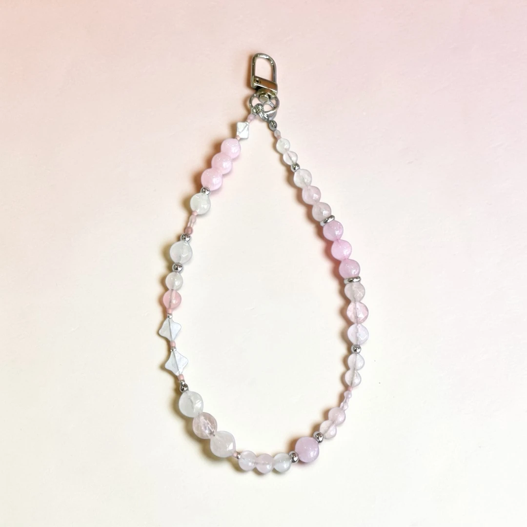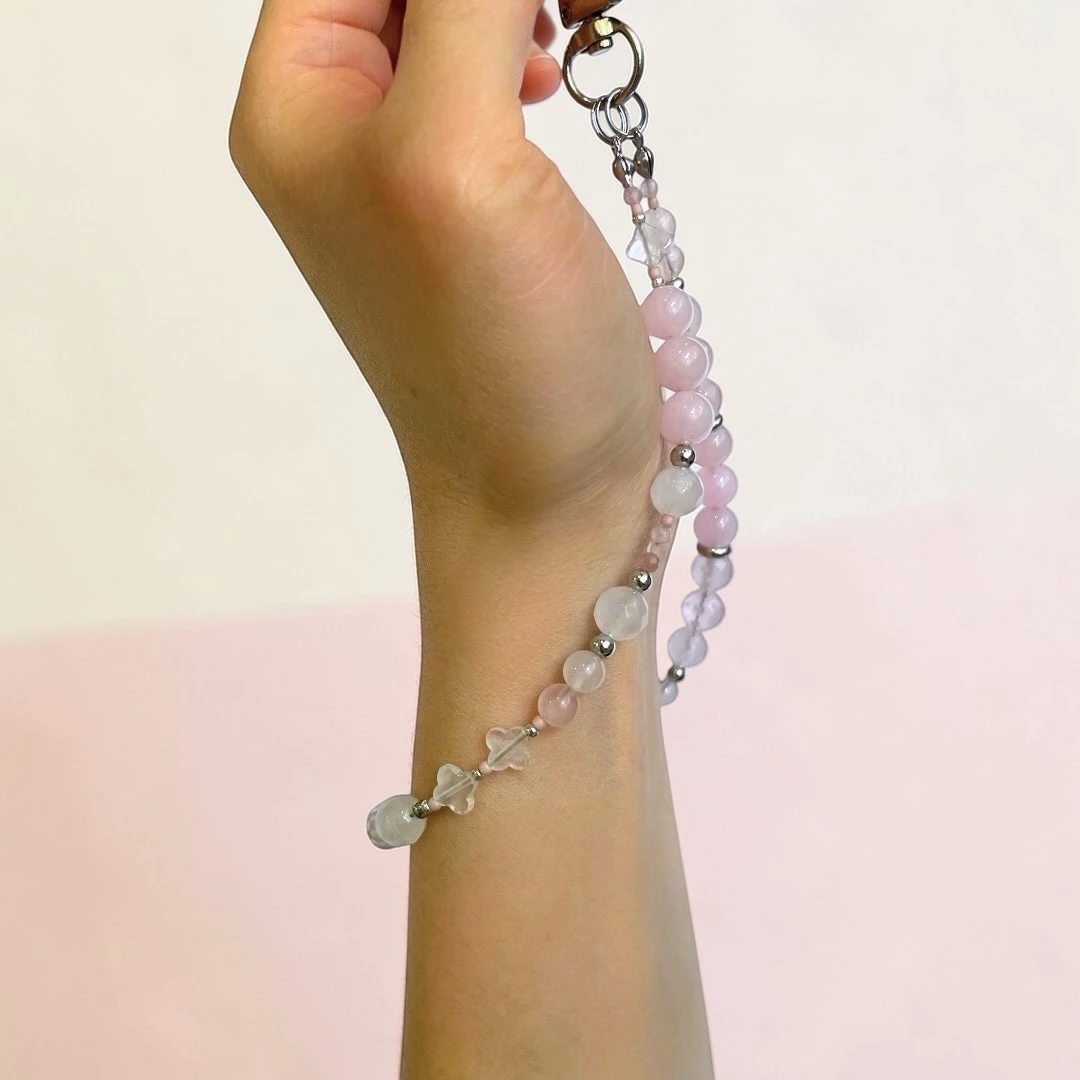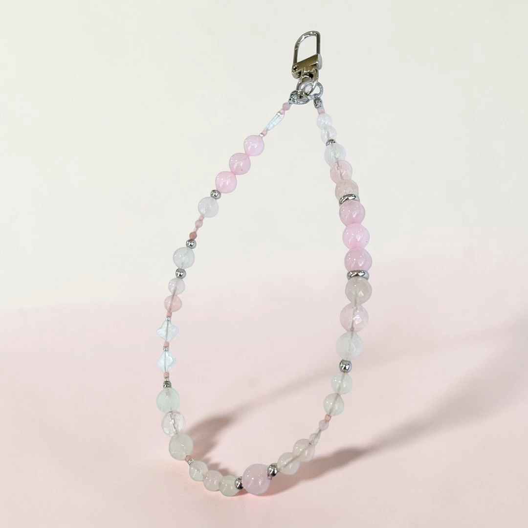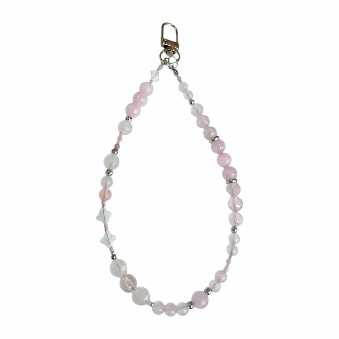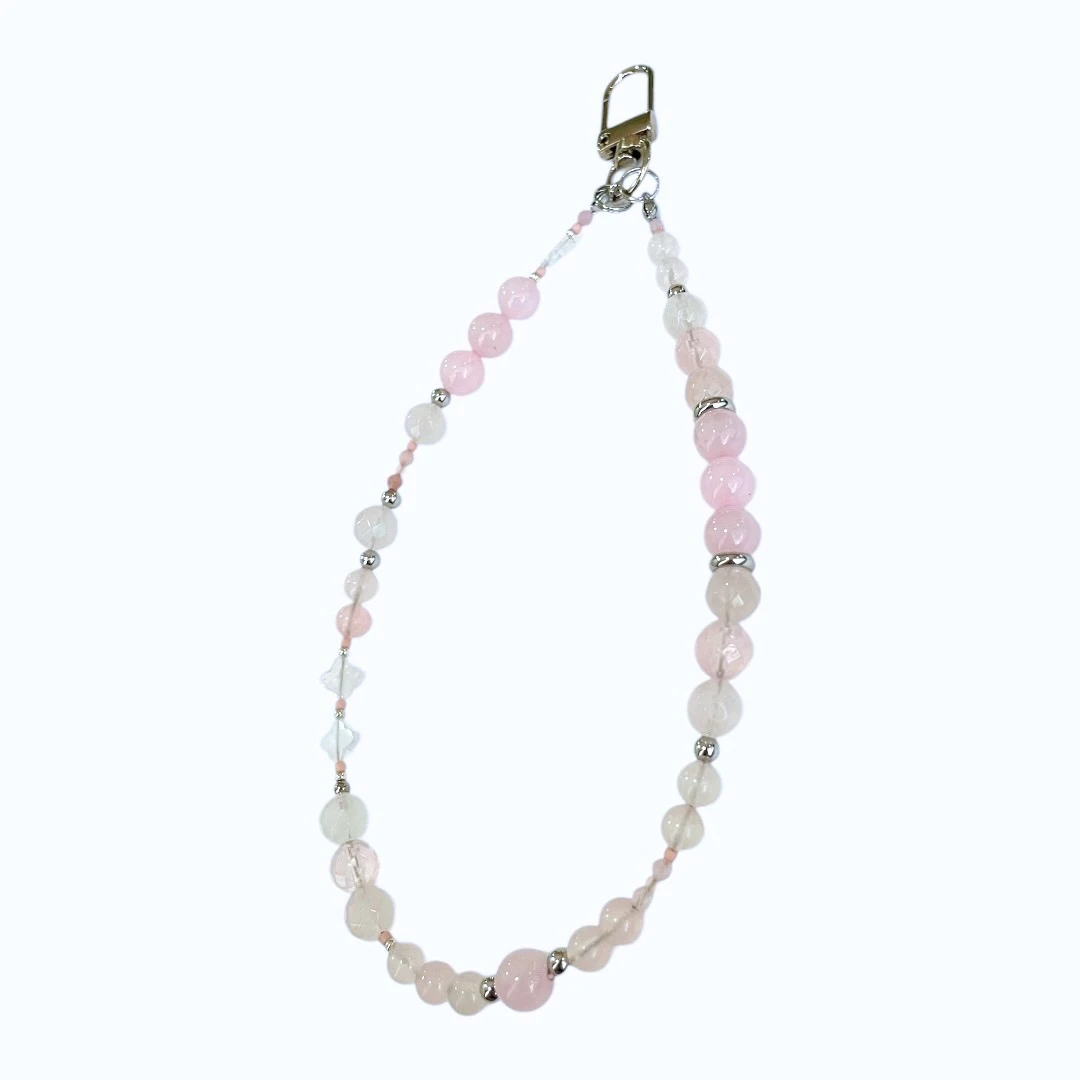 Handmade phone wristlet with natural Rose Quartz beads, stainless steel spacer beads and Japanese seed beads.