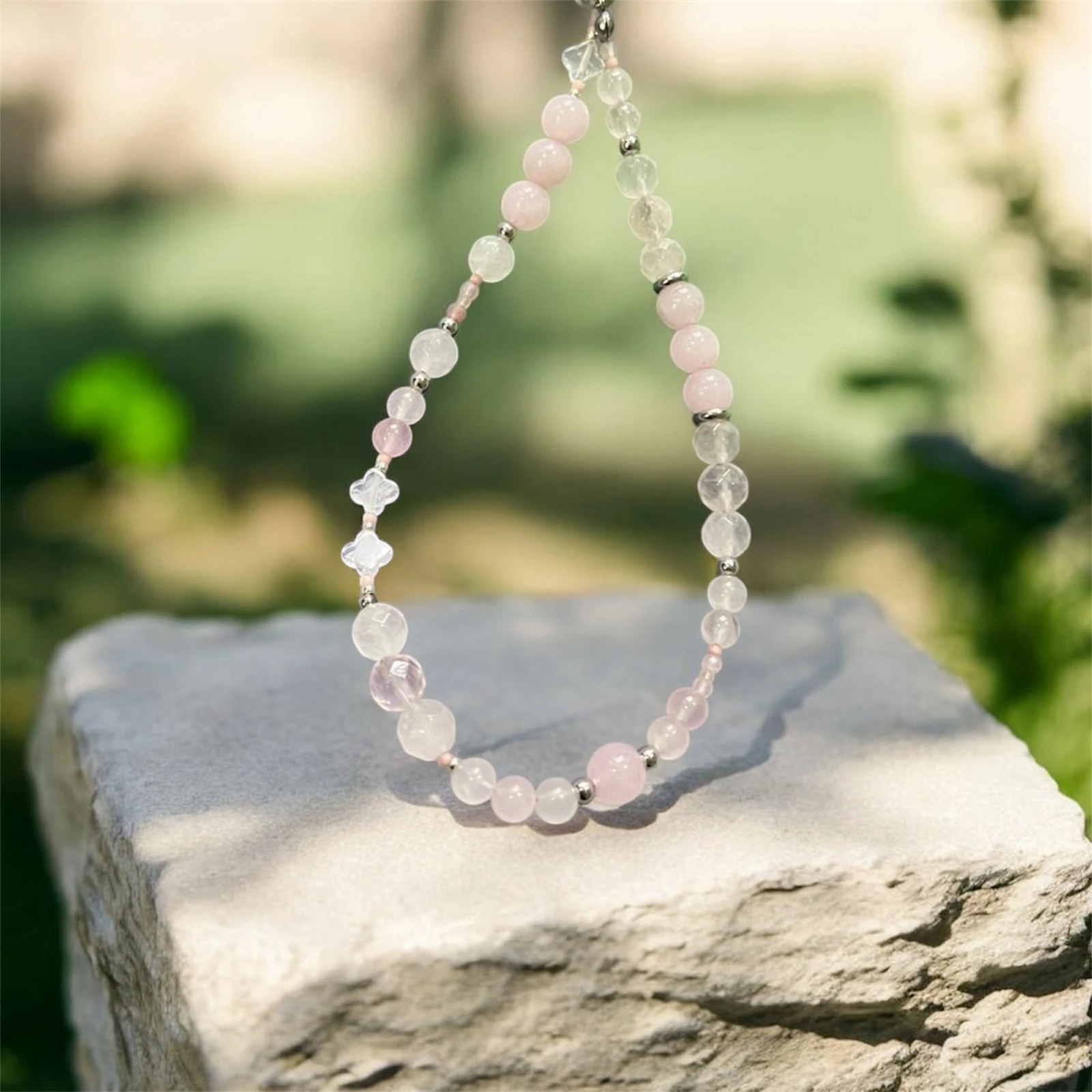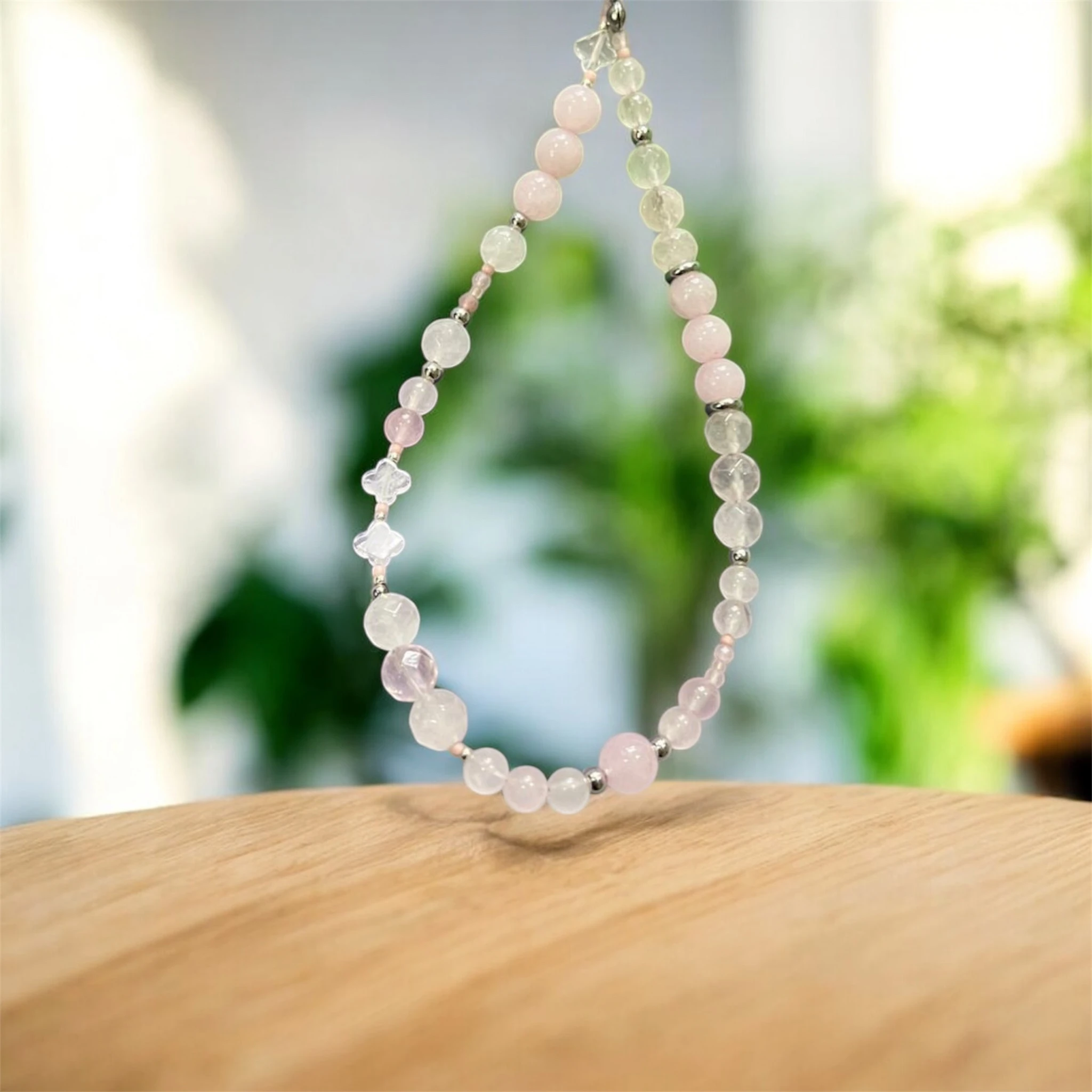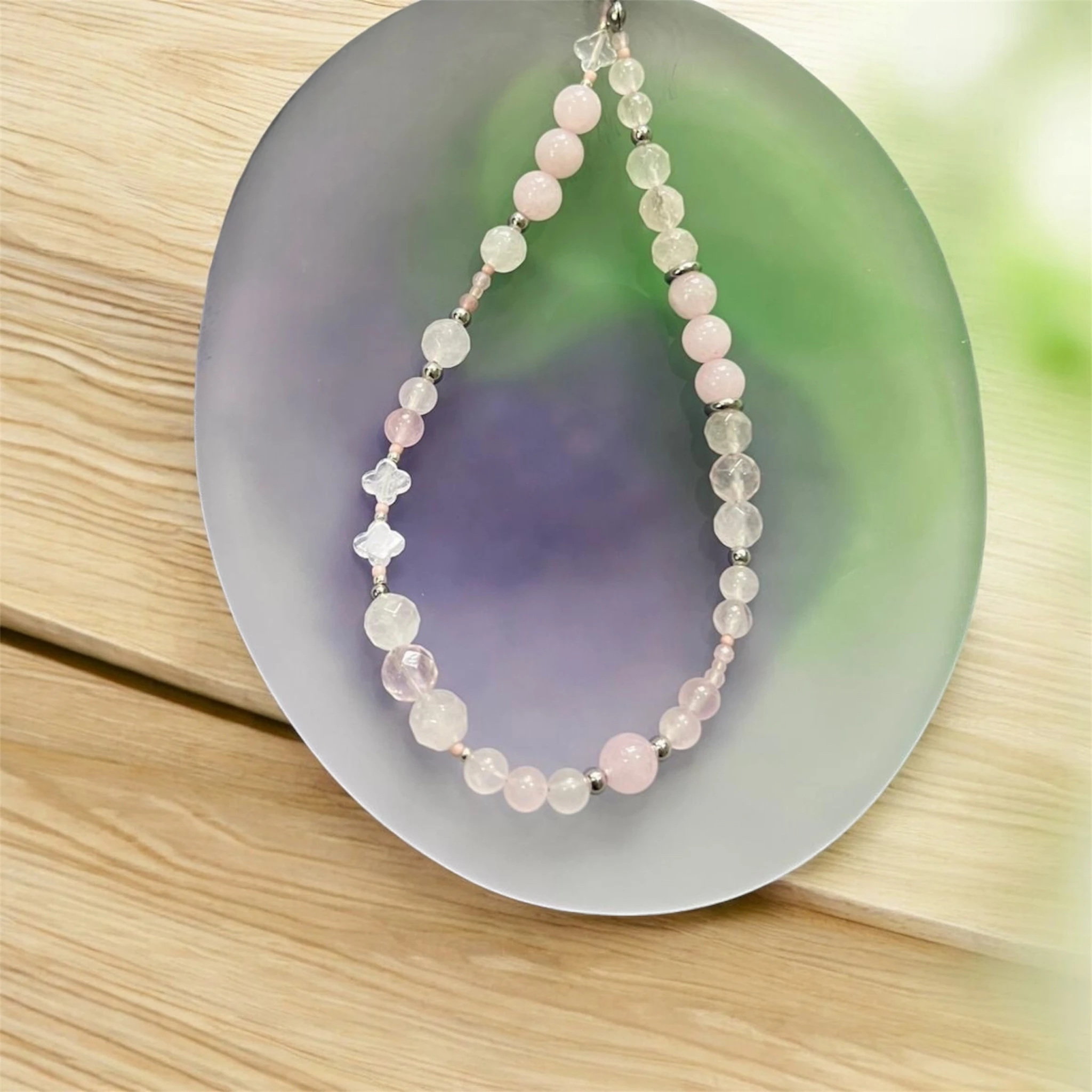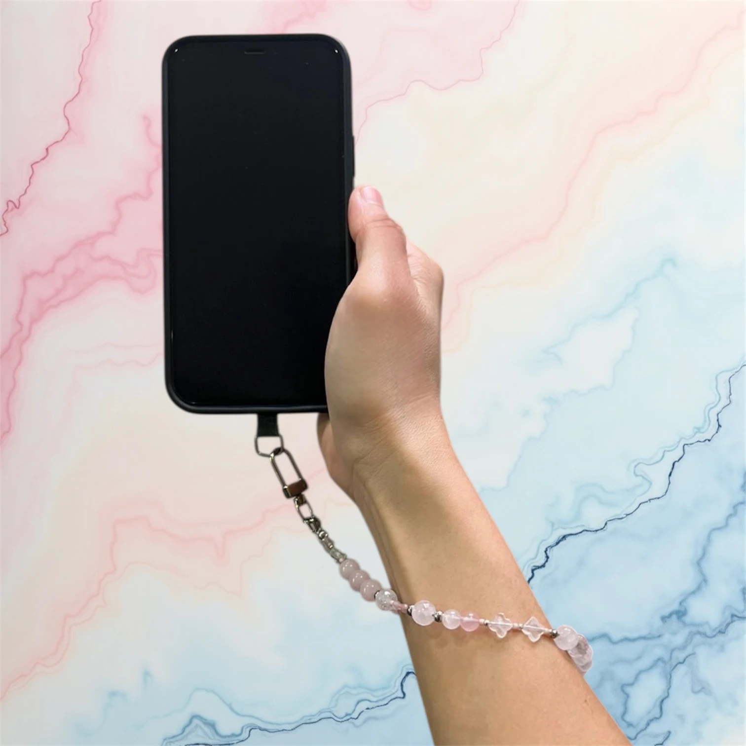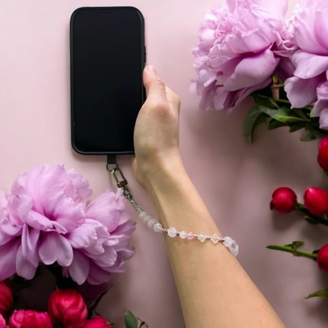 Handmade phone wristlet with natural Rose Quartz beads, stainless steel spacer beads and Japanese seed beads.